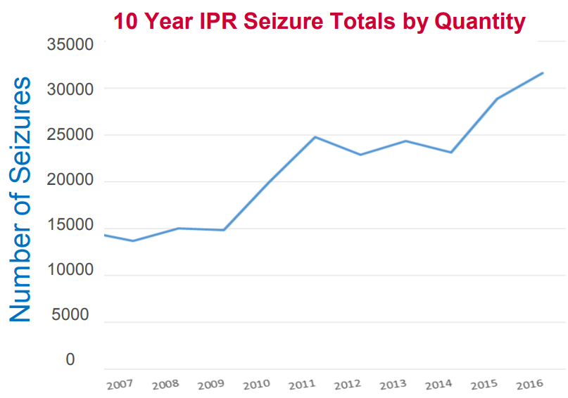 Thanks to improved reporting processes, intellectual property seizures more than doubled from 2007 to 2016, from less than 14,000 seizures to more than 31,000.